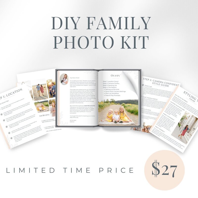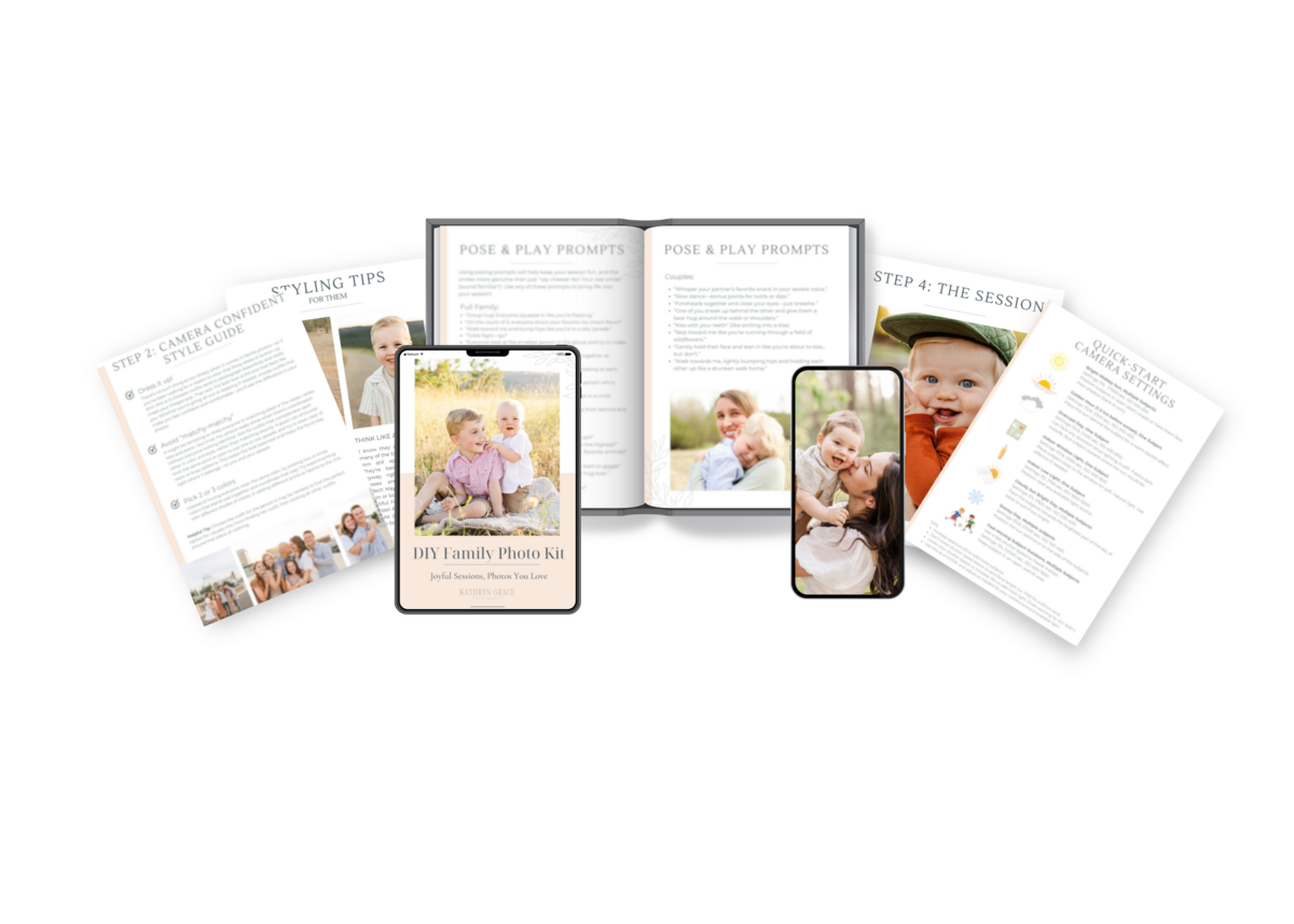 The DIY Family Photo Kit is a 22 page digital PDF booklet covering everything from location tips, choosing outfits, shot list, posing prompts, camera setting suggestions and more so you can be your own family photo pro.